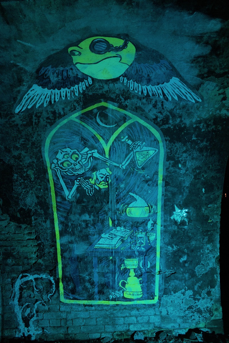 Новая дорога к старому Храму От Редакции. За шесть дней, прошедших с момента Инаугурации Психоактивного Капища, многим конфидентам удалось таки до него добраться – и это радует. Настало время рассказать об этом большом и важном проекте. Четыре с половиной года назад нам на почту пришло странное письмо, содержащее любопытные размышления о Духе и Процессе, а также фотоотчет о сооружении в неком городе Некробурге Капища психической юности – с Ардханаришварой, Бафометом, здоровенным крестом и психическим телевидением. Местоположение не указывалось, но нескольких явно специально оставленных в письме зацепок было достаточно, чтобы понять, о какой именно заброшенной четырехэтажке на В.О. шла речь. С тех пор многие конфиденты и члены Редакции успели побывать на этом Капище. Со временем оно было разрушено и теперь уже окончательно закрыто. Каково же было наше удивление, когда спустя столько времени нам пришло еще одно письмо – также в 23:23, также с выспренним размышлением и фотоотчетом. В этот раз, правда, не летом, а перед наступлением холодов. Ниже мы приводим полный текст письма вместе с фотоматериалами, отснятыми нами после посещения Капища. Как и в прошлый раз, нам остается только гадать, кто ответственен за это Капище. В прошлый раз версий было много: от конфидентов, готовящихся к оккультному ренессансу, до глубоко законспирированной структуры внутри самой «Катабазии»… Теперь ни одна из этих версий не кажется нам убедительной; в новом письме, как и в старом, есть список строителей – но почти все они с тех пор сменились. Зато Храм, кажется, остался прежним. fr.Chmn Занимательно зрелище разоренного храма, который ты сам устраивал. Похоже на труп друга – лицо вроде то же, а вот друг… Кто-то скажет, что не стало, кто-то что просто не здесь. С капищем проще: вот оно разорено – и вот оно снова явлено. Совершенно иное, сделанное другими людьми, на другом уровне исполнения, в совершенно ином месте… И все то же – памятник всепобеждающей психической юности; как и в прошлый раз, формула мятежного Духа, вошедшего в плоть реальности вопреки условностям, запретам, рутине и элементарной вероятности. Хотя, конечно, по уровню исполнения и сложности старое новому в подметки не годится. Живописное историческое место, впрочем, не оцененное современниками; много недель тяжелого кропотливого труда, СПЕЦИАЛЬНЫЕ ТЕХНОЛОГИИ, ведра пота многих людей и удивительные открытия с некоторыми даже потерями в процессе. Однако это вновь – место мифопоэтической персонализации того, что каждый из участников изволил привести сюда. Четыре главные фигуры вокруг креста – похожи на божественные, но по сути скорее героические: обоеполая Богинюшка и бесполый психический Андрогин, Иерофант, Жрица – пробужденные души современности, и их ты, может быть, уже не раз встречал, закутанных в лохмотья разнообразных человеков. У их ног горят немеркнущие огни Психического телевидения – его провели и сюда. Оседлавшая Зверя стигматизации Бабалон, не расстающаяся с чашей мерзостей, и краснорожий Архонт – самые крупные фигуры, но тоже не божественные, скорее титанические – стихийные и в чистом своем виде скорее дурные, но, увы, как никогда актуальные. В одном углу – алхимик, смешивающий гремучие смеси – наша символическая дань истинному королевскому Искусству; в другом занимаются пор