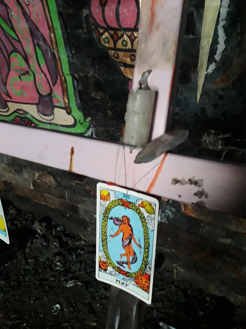 Новая дорога к старому Храму От Редакции. За шесть дней, прошедших с момента Инаугурации Психоактивного Капища, многим конфидентам удалось таки до него добраться – и это радует. Настало время рассказать об этом большом и важном проекте. Четыре с половиной года назад нам на почту пришло странное письмо, содержащее любопытные размышления о Духе и Процессе, а также фотоотчет о сооружении в неком городе Некробурге Капища психической юности – с Ардханаришварой, Бафометом, здоровенным крестом и психическим телевидением. Местоположение не указывалось, но нескольких явно специально оставленных в письме зацепок было достаточно, чтобы понять, о какой именно заброшенной четырехэтажке на В.О. шла речь. С тех пор многие конфиденты и члены Редакции успели побывать на этом Капище. Со временем оно было разрушено и теперь уже окончательно закрыто. Каково же было наше удивление, когда спустя столько времени нам пришло еще одно письмо – также в 23:23, также с выспренним размышлением и фотоотчетом. В этот раз, правда, не летом, а перед наступлением холодов. Ниже мы приводим полный текст письма вместе с фотоматериалами, отснятыми нами после посещения Капища. Как и в прошлый раз, нам остается только гадать, кто ответственен за это Капище. В прошлый раз версий было много: от конфидентов, готовящихся к оккультному ренессансу, до глубоко законспирированной структуры внутри самой «Катабазии»… Теперь ни одна из этих версий не кажется нам убедительной; в новом письме, как и в старом, есть список строителей – но почти все они с тех пор сменились. Зато Храм, кажется, остался прежним. fr.Chmn Занимательно зрелище разоренного храма, который ты сам устраивал. Похоже на труп друга – лицо вроде то же, а вот друг… Кто-то скажет, что не стало, кто-то что просто не здесь. С капищем проще: вот оно разорено – и вот оно снова явлено. Совершенно иное, сделанное другими людьми, на другом уровне исполнения, в совершенно ином месте… И все то же – памятник всепобеждающей психической юности; как и в прошлый раз, формула мятежного Духа, вошедшего в плоть реальности вопреки условностям, запретам, рутине и элементарной вероятности. Хотя, конечно, по уровню исполнения и сложности старое новому в подметки не годится. Живописное историческое место, впрочем, не оцененное современниками; много недель тяжелого кропотливого труда, СПЕЦИАЛЬНЫЕ ТЕХНОЛОГИИ, ведра пота многих людей и удивительные открытия с некоторыми даже потерями в процессе. Однако это вновь – место мифопоэтической персонализации того, что каждый из участников изволил привести сюда. Четыре главные фигуры вокруг креста – похожи на божественные, но по сути скорее героические: обоеполая Богинюшка и бесполый психический Андрогин, Иерофант, Жрица – пробужденные души современности, и их ты, может быть, уже не раз встречал, закутанных в лохмотья разнообразных человеков. У их ног горят немеркнущие огни Психического телевидения – его провели и сюда. Оседлавшая Зверя стигматизации Бабалон, не расстающаяся с чашей мерзостей, и краснорожий Архонт – самые крупные фигуры, но тоже не божественные, скорее титанические – стихийные и в чистом своем виде скорее дурные, но, увы, как никогда актуальные. В одном углу – алхимик, смешивающий гремучие смеси – наша символическая дань истинному королевскому Искусству; в другом занимаются пор
