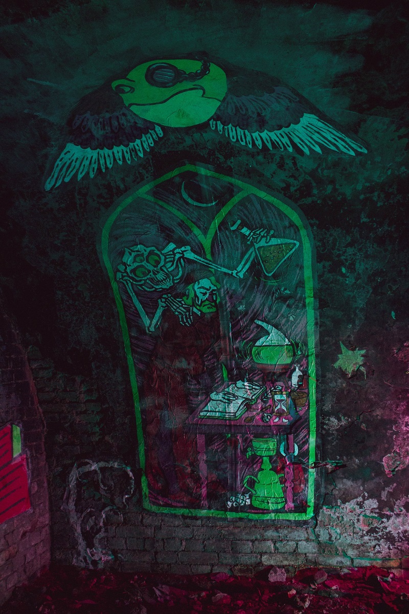 Новая дорога к старому Храму От Редакции. За шесть дней, прошедших с момента Инаугурации Психоактивного Капища, многим конфидентам удалось таки до него добраться – и это радует. Настало время рассказать об этом большом и важном проекте. Четыре с половиной года назад нам на почту пришло странное письмо, содержащее любопытные размышления о Духе и Процессе, а также фотоотчет о сооружении в неком городе Некробурге Капища психической юности – с Ардханаришварой, Бафометом, здоровенным крестом и психическим телевидением. Местоположение не указывалось, но нескольких явно специально оставленных в письме зацепок было достаточно, чтобы понять, о какой именно заброшенной четырехэтажке на В.О. шла речь. С тех пор многие конфиденты и члены Редакции успели побывать на этом Капище. Со временем оно было разрушено и теперь уже окончательно закрыто. Каково же было наше удивление, когда спустя столько времени нам пришло еще одно письмо – также в 23:23, также с выспренним размышлением и фотоотчетом. В этот раз, правда, не летом, а перед наступлением холодов. Ниже мы приводим полный текст письма вместе с фотоматериалами, отснятыми нами после посещения Капища. Как и в прошлый раз, нам остается только гадать, кто ответственен за это Капище. В прошлый раз версий было много: от конфидентов, готовящихся к оккультному ренессансу, до глубоко законспирированной структуры внутри самой «Катабазии»… Теперь ни одна из этих версий не кажется нам убедительной; в новом письме, как и в старом, есть список строителей – но почти все они с тех пор сменились. Зато Храм, кажется, остался прежним. fr.Chmn Занимательно зрелище разоренного храма, который ты сам устраивал. Похоже на труп друга – лицо вроде то же, а вот друг… Кто-то скажет, что не стало, кто-то что просто не здесь. С капищем проще: вот оно разорено – и вот оно снова явлено. Совершенно иное, сделанное другими людьми, на другом уровне исполнения, в совершенно ином месте… И все то же – памятник всепобеждающей психической юности; как и в прошлый раз, формула мятежного Духа, вошедшего в плоть реальности вопреки условностям, запретам, рутине и элементарной вероятности. Хотя, конечно, по уровню исполнения и сложности старое новому в подметки не годится. Живописное историческое место, впрочем, не оцененное современниками; много недель тяжелого кропотливого труда, СПЕЦИАЛЬНЫЕ ТЕХНОЛОГИИ, ведра пота многих людей и удивительные открытия с некоторыми даже потерями в процессе. Однако это вновь – место мифопоэтической персонализации того, что каждый из участников изволил привести сюда. Четыре главные фигуры вокруг креста – похожи на божественные, но по сути скорее героические: обоеполая Богинюшка и бесполый психический Андрогин, Иерофант, Жрица – пробужденные души современности, и их ты, может быть, уже не раз встречал, закутанных в лохмотья разнообразных человеков. У их ног горят немеркнущие огни Психического телевидения – его провели и сюда. Оседлавшая Зверя стигматизации Бабалон, не расстающаяся с чашей мерзостей, и краснорожий Архонт – самые крупные фигуры, но тоже не божественные, скорее титанические – стихийные и в чистом своем виде скорее дурные, но, увы, как никогда актуальные. В одном углу – алхимик, смешивающий гремучие смеси – наша символическая дань истинному королевскому Искусству; в другом занимаются пор