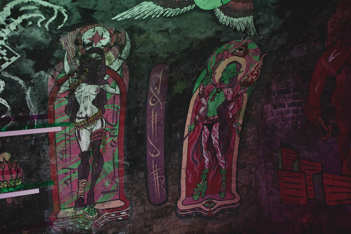 Новая дорога к старому Храму От Редакции. За шесть дней, прошедших с момента Инаугурации Психоактивного Капища, многим конфидентам удалось таки до него добраться – и это радует. Настало время рассказать об этом большом и важном проекте. Четыре с половиной года назад нам на почту пришло странное письмо, содержащее любопытные размышления о Духе и Процессе, а также фотоотчет о сооружении в неком городе Некробурге Капища психической юности – с Ардханаришварой, Бафометом, здоровенным крестом и психическим телевидением. Местоположение не указывалось, но нескольких явно специально оставленных в письме зацепок было достаточно, чтобы понять, о какой именно заброшенной четырехэтажке на В.О. шла речь. С тех пор многие конфиденты и члены Редакции успели побывать на этом Капище. Со временем оно было разрушено и теперь уже окончательно закрыто. Каково же было наше удивление, когда спустя столько времени нам пришло еще одно письмо – также в 23:23, также с выспренним размышлением и фотоотчетом. В этот раз, правда, не летом, а перед наступлением холодов. Ниже мы приводим полный текст письма вместе с фотоматериалами, отснятыми нами после посещения Капища. Как и в прошлый раз, нам остается только гадать, кто ответственен за это Капище. В прошлый раз версий было много: от конфидентов, готовящихся к оккультному ренессансу, до глубоко законспирированной структуры внутри самой «Катабазии»… Теперь ни одна из этих версий не кажется нам убедительной; в новом письме, как и в старом, есть список строителей – но почти все они с тех пор сменились. Зато Храм, кажется, остался прежним. fr.Chmn Занимательно зрелище разоренного храма, который ты сам устраивал. Похоже на труп друга – лицо вроде то же, а вот друг… Кто-то скажет, что не стало, кто-то что просто не здесь. С капищем проще: вот оно разорено – и вот оно снова явлено. Совершенно иное, сделанное другими людьми, на другом уровне исполнения, в совершенно ином месте… И все то же – памятник всепобеждающей психической юности; как и в прошлый раз, формула мятежного Духа, вошедшего в плоть реальности вопреки условностям, запретам, рутине и элементарной вероятности. Хотя, конечно, по уровню исполнения и сложности старое новому в подметки не годится. Живописное историческое место, впрочем, не оцененное современниками; много недель тяжелого кропотливого труда, СПЕЦИАЛЬНЫЕ ТЕХНОЛОГИИ, ведра пота многих людей и удивительные открытия с некоторыми даже потерями в процессе. Однако это вновь – место мифопоэтической персонализации того, что каждый из участников изволил привести сюда. Четыре главные фигуры вокруг креста – похожи на божественные, но по сути скорее героические: обоеполая Богинюшка и бесполый психический Андрогин, Иерофант, Жрица – пробужденные души современности, и их ты, может быть, уже не раз встречал, закутанных в лохмотья разнообразных человеков. У их ног горят немеркнущие огни Психического телевидения – его провели и сюда. Оседлавшая Зверя стигматизации Бабалон, не расстающаяся с чашей мерзостей, и краснорожий Архонт – самые крупные фигуры, но тоже не божественные, скорее титанические – стихийные и в чистом своем виде скорее дурные, но, увы, как никогда актуальные. В одном углу – алхимик, смешивающий гремучие смеси – наша символическая дань истинному королевскому Искусству; в другом занимаются пор