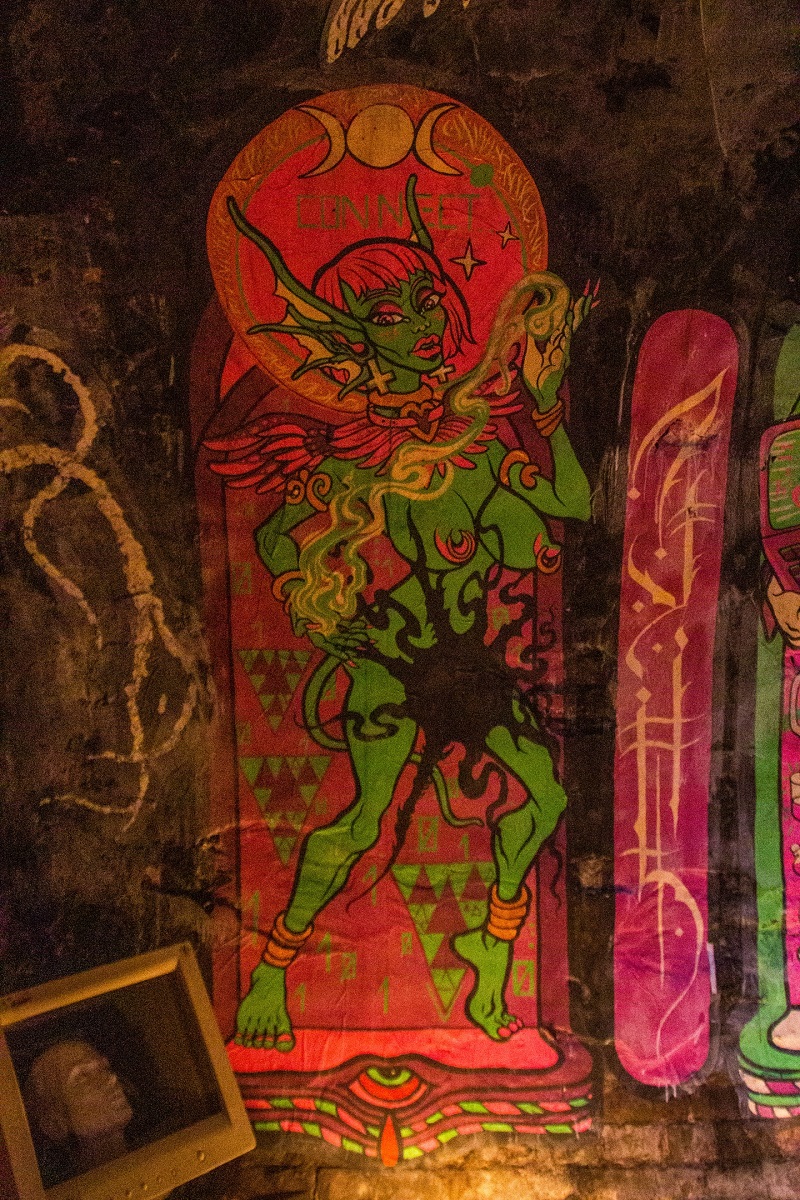 Новая дорога к старому Храму От Редакции. За шесть дней, прошедших с момента Инаугурации Психоактивного Капища, многим конфидентам удалось таки до него добраться – и это радует. Настало время рассказать об этом большом и важном проекте. Четыре с половиной года назад нам на почту пришло странное письмо, содержащее любопытные размышления о Духе и Процессе, а также фотоотчет о сооружении в неком городе Некробурге Капища психической юности – с Ардханаришварой, Бафометом, здоровенным крестом и психическим телевидением. Местоположение не указывалось, но нескольких явно специально оставленных в письме зацепок было достаточно, чтобы понять, о какой именно заброшенной четырехэтажке на В.О. шла речь. С тех пор многие конфиденты и члены Редакции успели побывать на этом Капище. Со временем оно было разрушено и теперь уже окончательно закрыто. Каково же было наше удивление, когда спустя столько времени нам пришло еще одно письмо – также в 23:23, также с выспренним размышлением и фотоотчетом. В этот раз, правда, не летом, а перед наступлением холодов. Ниже мы приводим полный текст письма вместе с фотоматериалами, отснятыми нами после посещения Капища. Как и в прошлый раз, нам остается только гадать, кто ответственен за это Капище. В прошлый раз версий было много: от конфидентов, готовящихся к оккультному ренессансу, до глубоко законспирированной структуры внутри самой «Катабазии»… Теперь ни одна из этих версий не кажется нам убедительной; в новом письме, как и в старом, есть список строителей – но почти все они с тех пор сменились. Зато Храм, кажется, остался прежним. fr.Chmn Занимательно зрелище разоренного храма, который ты сам устраивал. Похоже на труп друга – лицо вроде то же, а вот друг… Кто-то скажет, что не стало, кто-то что просто не здесь. С капищем проще: вот оно разорено – и вот оно снова явлено. Совершенно иное, сделанное другими людьми, на другом уровне исполнения, в совершенно ином месте… И все то же – памятник всепобеждающей психической юности; как и в прошлый раз, формула мятежного Духа, вошедшего в плоть реальности вопреки условностям, запретам, рутине и элементарной вероятности. Хотя, конечно, по уровню исполнения и сложности старое новому в подметки не годится. Живописное историческое место, впрочем, не оцененное современниками; много недель тяжелого кропотливого труда, СПЕЦИАЛЬНЫЕ ТЕХНОЛОГИИ, ведра пота многих людей и удивительные открытия с некоторыми даже потерями в процессе. Однако это вновь – место мифопоэтической персонализации того, что каждый из участников изволил привести сюда. Четыре главные фигуры вокруг креста – похожи на божественные, но по сути скорее героические: обоеполая Богинюшка и бесполый психический Андрогин, Иерофант, Жрица – пробужденные души современности, и их ты, может быть, уже не раз встречал, закутанных в лохмотья разнообразных человеков. У их ног горят немеркнущие огни Психического телевидения – его провели и сюда. Оседлавшая Зверя стигматизации Бабалон, не расстающаяся с чашей мерзостей, и краснорожий Архонт – самые крупные фигуры, но тоже не божественные, скорее титанические – стихийные и в чистом своем виде скорее дурные, но, увы, как никогда актуальные. В одном углу – алхимик, смешивающий гремучие смеси – наша символическая дань истинному королевскому Искусству; в другом занимаются пор