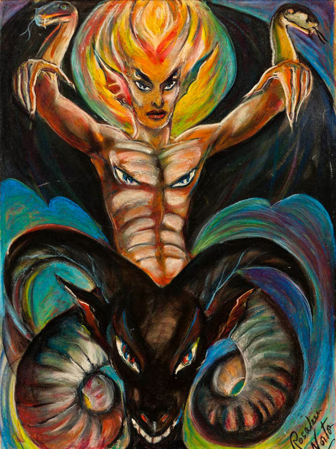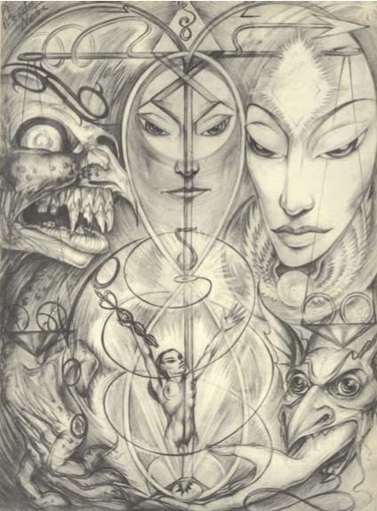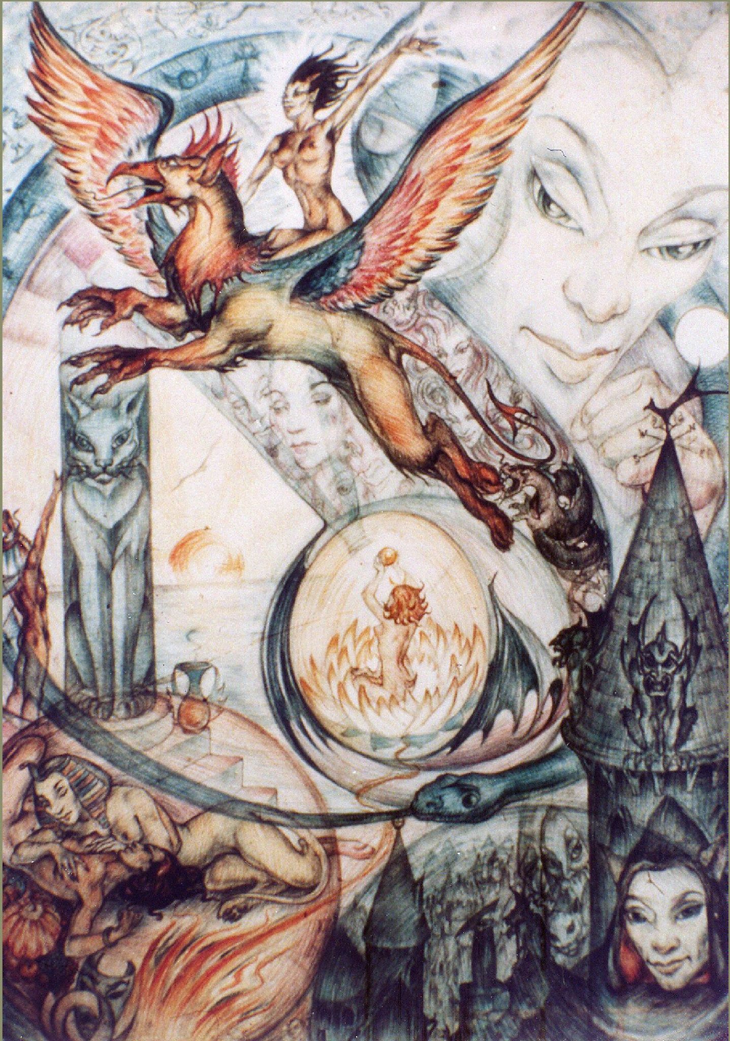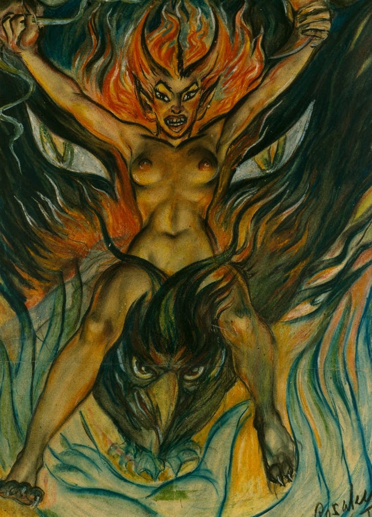 «Книга Лжей» Ричарда Метцгера, глава 21: Розалин Нортон — Дочь Пана Невилл Друри Розалин Нортон (1917-1979) называют самой известной австралийской ведьмой, хотя её слава давно стала всемирной. Американский режиссёр-авангардист Кеннет Энгер, всю жизнь интересовавшийся оккультной мифологией и посещавший Аббатство Алистера Кроули в Чефалу, предлагал снять о ней фильм. Она послужила вдохновением для нескольких романов и пьесы. Розалин, бесспорно, относится к числу самых выдающихся современных художников, творивших на тему сверхъественного. Всю жизнь вплоть до смерти в 1979 году Розалин жила в Сиднее, в мрачной квартире на цокольном этаже дряхлой многоэтажки недалеко от фонтана Эль-Аламейна в районе Кингс-Кросс. В одной из комнат она воздвигла священный алтарь в честь рогатого бога Пана, древнегреческого покровителя деревенской жизни и Бога Природы. При этом она ни с кем не делилась своими идеями и убеждениями, и жила отшельницей посреди окружавшей ее бурной ночной жизни. Когда-то муралы и росписи Розалин Нортон украшали стены нескольких популярных кафе в Кингс-Кросс, но те времена давно прошли. Самое знаменитое из них снесли, проложив объездную дорогу на восточный пригород. Зенит ее славы пришёлся на 1940-е и 1950-е, когда её знали как эксцентричную богемную ведьму: она носила эпатажные блузки и яркие банданы, затягивалась сигаретами через гравированный мундштук и выщипывала брови зловещей аркой. Хрупкого телосложения, с длинными кудрявыми волосами, она всегда излучала какое-то магнетическое притяжение, выделяющее её из толпы. Наполовину человеческие, наполовину звериные, её живописные персонажи были ещё более скандальны, чем провокационные обнажённые формы в работах Нормана Линдсея. Она изображала обнажённых женщин, борющихся с рептилиями-элементалями или летящих верхом на крылатых грифонах, и богов-гермафродитов с когтистыми перепончатыми крыльями. Сейчас, когда фэнтези во всём своём сверхъестественном и сюрреалистичном многообразии украшает многочисленные футболки, постеры и обложки дисков, работы Розалин не слишком выделяются. Но в сороковые и пятидесятые, сразу после Второй мировой, они казались оскорблением человеческого достоинства и попранием религиозных устоев. Розалин Нортон родилась в 1917 году в Данидине во время жуткого шторма. Позже она назвала его причиной своей любви к ночной стороне жизни. Уже в возрасте трёх лет ей нравилось рисовать «пустых зверей»: призраков со звериными головами и руками-щупальцами. В пять лет ей явилось видение светящегося дракона, стоящего у её кровати. Это убедило её в существовании мира духов, и вскоре она обнаружила, что эти верования противоречат ортодоксальным взглядам родителей. Отец Розалин, двоюродный брат композитора Воана Уильямса, служил капитаном в торговом флоте, а её мать была «конвенциональной, очень эмоциональной женщиной, которую поглотил семейный быт». В 1925 году Нортоны покинули Новую Зеландию и обосновались в Линфилде, пригороде Сиднея. Там юная Розалин провела вместе с родителями последующие десять лет. И с каждым годом ей становилось всё сложнее находить общий язык с матерью, так что она предпочитала компанию старшей сестры и любимой тёти. К четырнадцати она определилась с тем, как будет жить дальше, готовясь испытать всё, что только сможет, «хорошее, плохое и пос