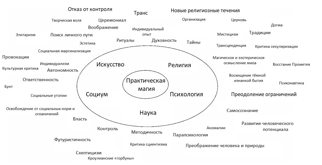 «Маги XXI века» — Герхард Майер От Редакции. Осмунд, Вильмут, Агриппа, Исбранд, Дирольф, Мейнрад, Остерхильд, Бальтус, Зельге, Рипольд и Нелиус — одиннадцать магов самого широкого спектра убеждений, от теургов и виккан до гностиков и сатанистов, участники организаций Servants of the Light, Builders of the Adytum, O.T.O., Fraternitas Saturni, Communitas Saturni, Illuminates of Thanateros, Church of Satan, Current of Set, In Nomine Satanis. Одиннадцать зрелых людей в возрасте от 32 до 52 лет (средний возраст — 38), объединенных исследованием 2009 года «Маги XXI века» Герхарда Майера, сотрудника немецкого Института пограничных областей психологии и психогигиены (Institut für Grenzgebiete der Psychologie und Psychohygiene e.V.) во Фрайбурге-им-Брайсгау. Цель исследования — грубо говоря, выяснить наконец-то, кого вообще следует называть магом и почему. Если оставить за скобками сциентические суеверия и примитивные воззрения прошлых веков на магов и магию как на «исторически и культурно далекие явления родом из примитивных культур» (если уж 15 лет назад столько зрелых практиков всех сортов и расцветок можно было собрать, то очевидно обратное), то на первый план выходят более интересные проблемы: каждая организация, а то и каждый практик понимают суть, цели, задачи, средства и темы магии и личного магического пути немного (или много) по-своему. Проще говоря, теург и сатанист будут обладать очень разной мотивацией и этикой, не говоря уже о целеполагании и представлениях о себе. При этом очевидные сходства тоже ясно видны будут даже в этих столь противоположных примерах, но распределение среди разнообразных практиков мотиваций, концепций и исповедуемых идей таково, что все попытки антропологов, теологов, религиоведов, социологов и психологов собрать их в единый пучок к 2009 году, по мнению Мейера, проваливались. Кроме анализа 11 интервью, которые, по замечанию Мейера, могли длиться до четырёх часов, в исследовании освещено еще три работы с актуальными выборками, а также сделано несколько попыток картографировать магию и определить личность мага. Все они наглядны, но лишь частично работоспособны. Зато демонстрируют основные проблемы такой задачи: все маги вне зависимости от убеждений, видимо, вынуждены совершать парадоксальный синтез разнородных явлений в нечто жизнеспособное. И, хотя это у них выходит достаточно часто, чтобы картографировать нахоженные ими кривые дорожки исследователю самому приходится выворачиваться наизнанку не менее причудливым образом. Учитывая, что Мейер — сам викарий, доктор теологии и ещё и юрист (!), то наблюдать за его мастерской эквилибристикой — большое удовольствие. fr.Chmn Театрализованный ритуал Кроули Rite of Saturn Для исследователей магия всегда была захватывающей темой. Но традиционно изучалась в контексте «ложного» или атавистического мышления — как нечто исторически или культурно далекое, родом из примитивных культур. Традиционные предрассудки о магии, заложенные эволюционизмом Эдвардом Б. Тайлора и Джеймса Фрейзера, функционализмом Марселя Мосса и Эмиля Дюркгейма, а также законом сопричастия Люсьена Леви-Брюля, зиждутся на этом контексте [1] — и они все еще сильны. Однако позже возникли также подходы, интерпретирующие магию как элемент эзотерического дискурса, более широко и свободно. [2] Но на академический дискурс они повлияли мало. Так что отношение магии к религии, науке и обществу все еще недостаточно прояс