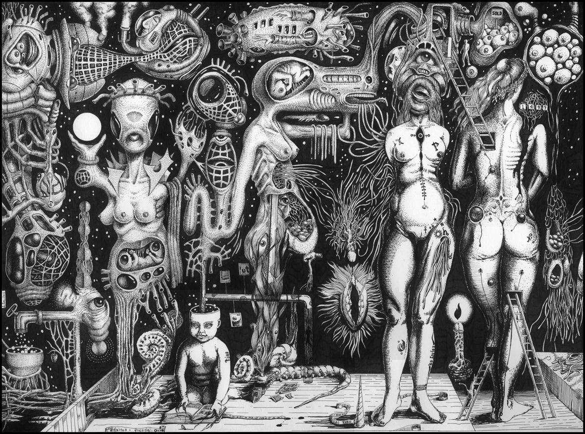 Нефилимы и майя Гектора Пинеды «Четыре нефилима: нежданное вторжение в человеческое познание», «Лилит», «Охотница и её сокровищница», «Ложь» — мексиканский художник и «тёмный сюрреалист» Гектор Пинеда весьма заинтересован в оккультных и мистических темах. Он никогда не высказывался об этом (да и вообще упоминаний о нём в сети кот наплакал), но на его рисунках можно отыскать и тетраграмматон, и руны, и сигилы, и отсылки к герметическим символам (и немножко — к гравюрам Дюрера). Сам он сообщает, что в творчестве отталкивается от особого впечатления, возникающего при соединении противоположностей: желания и отвращения, красоты и насилия, жизни и смерти. Пинеда рисует карандашом и чернилами, делает коллажи, иногда занимается диджитал-артом и фотографией. Он получил образование фармацевта, а потом десять лет работал в логистике — но от судьбы, видимо, не уйдешь. И это прекрасно: только посмотрите на милашку Адика на ручках у Трумпи! Ложь « ‹ из 38 › » Просмотры: 46 Навигация по записям «Книга Лжей» Ричарда Метцгера, глава 33: Медийное проклятье Хаким Бея Добавить комментарий Отменить ответВаш адрес email не будет опубликован. Обязательные поля помечены *Комментарий * Имя * Email * Сайт Сохранить моё имя, email и адрес сайта в этом браузере для последующих моих комментариев.